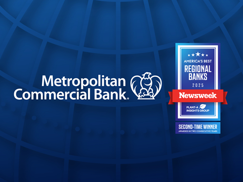 Metropolitan Commercial Bank was named one of Newsweek’s Best Regional Banks and Credit Unions 2024. The Bank was ranked by Independent Community Bankers of America among the top ten successful loan producers for 2023 by loan category and asset size for commercial banks with more than $1 billion in assets. Kroll affirmed a BBB+ (investment grade) deposit rating on January 25, 2024. For the fourth time, MCB has earned a place in the Piper Sandler Bank Sm-All Stars Class of 2024.